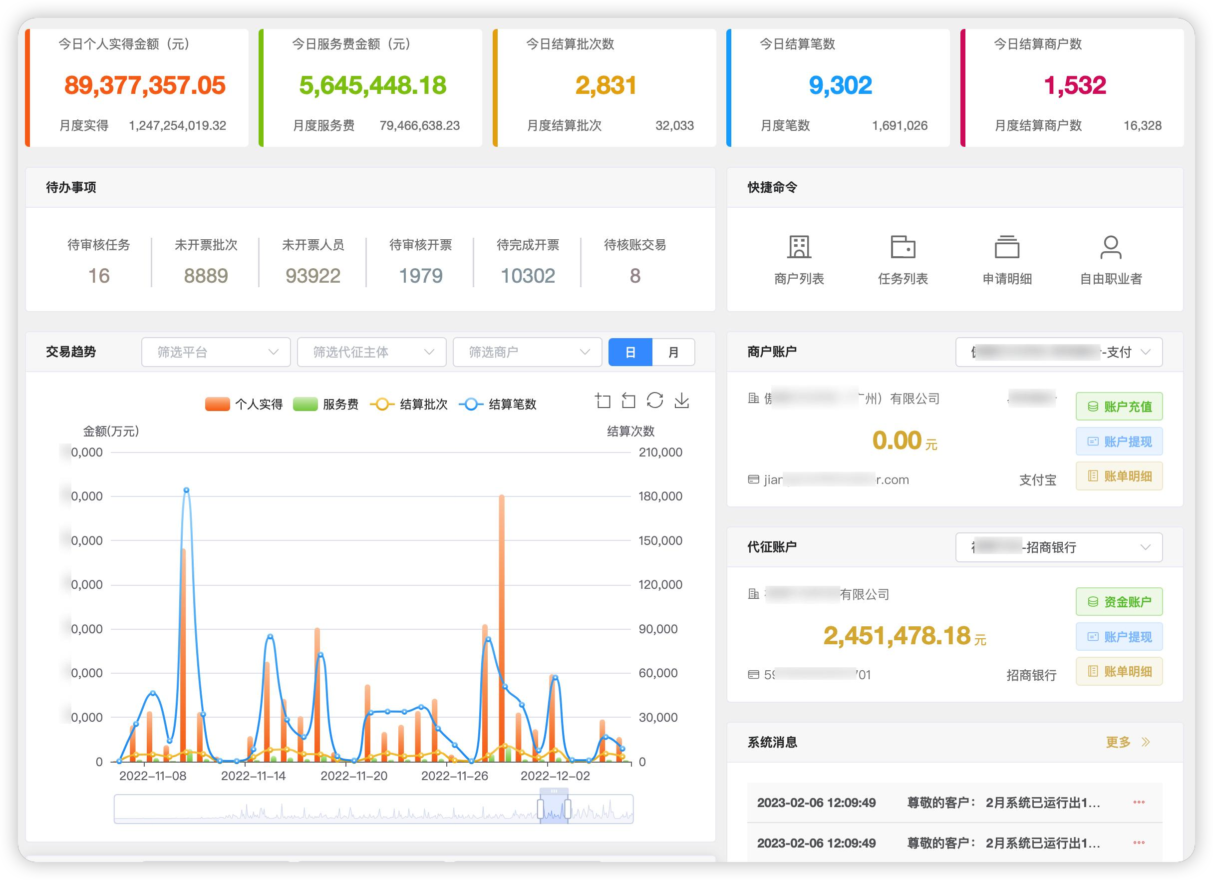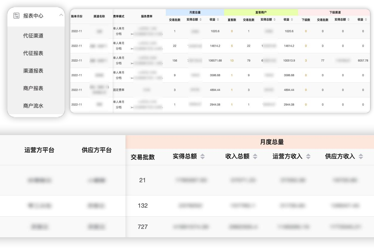 • 实时展示交易、开票及渠道分佣的日/月趋势图